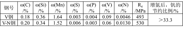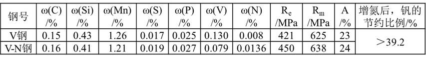 1  試驗(yàn)用鋼的化學(xué)成分、力學(xué)性能和釩節(jié)約比例的試驗(yàn)結(jié)果