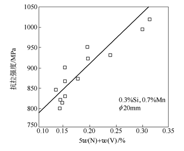 在鈮、釩、鈦三種主要微合金化元素中,釩的溶解度最高,在1150℃較低的加熱溫度下,只有釩能全部固溶在奧氏體中。特別是在碳含量較高的非調(diào)質(zhì)鋼的情況下,鈮和鈦的溶解度都明顯下降,只有釩仍具有較高的溶解度,所以釩是非調(diào)質(zhì)鋼用得最多的沉淀強(qiáng)化元素。由于釩與氮的親和力比碳大得多,加入鋼中的釩很容易以富氮的碳氮化物的形式析出。其中氮化釩(或碳氮化釩)比碳化釩的溶解度低得多,因而穩(wěn)定性好,在鋼中能高度彌散分布,可獲得顯著的強(qiáng)化效應(yīng),如圖1所示,氮能顯著提高非調(diào)質(zhì)鋼的強(qiáng)度。釩和氮的復(fù)合作用,既可提高強(qiáng)度,又能保持較好的韌性,因此氮就成為了非調(diào)質(zhì)鋼不可缺少的廉價(jià)合金元素了,從而為非調(diào)質(zhì)鋼節(jié)約合金元素釩、降低鋼的制造成本奠定了基礎(chǔ)。