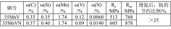 3給出了非調(diào)質(zhì)試驗(yàn)用鋼的化學(xué)成分、力學(xué)性能和釩的節(jié)約比例的試驗(yàn)結(jié)果。由表3可以看出,在中碳非調(diào)質(zhì)35MnV鋼的情況下,當(dāng)碳和錳含量基本相同或接近、氮含量從0.006%增加到0.014%時(shí),在保證力學(xué)性能基本相同的前提下,則釩的添加量至少可減少25%以上。