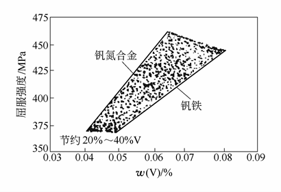 在釩鋼中加入適量的氮,一方面,顯著促進(jìn)V(C,N)的析出,細(xì)化鋼的鐵素體晶粒,提高鋼的強(qiáng)度,改善鋼的塑韌性,使鋼獲得了良好的綜合性能;另一方面,在保證原鋼種強(qiáng)度水平的前提下,在釩鋼中增加適量的氮可減少釩的加入量,對(duì)鋼的制造者來(lái)說(shuō)可以產(chǎn)生明顯的經(jīng)濟(jì)效益,降低鋼的生產(chǎn)成本。為了說(shuō)明這個(gè)問(wèn)題,以下舉幾個(gè)鋼材品種的實(shí)例深入說(shuō)明增氮帶來(lái)的經(jīng)濟(jì)效益。