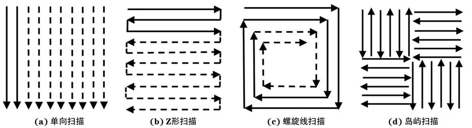 在SLM工藝中,掃描策略會(huì)對(duì)金屬零部件的成形質(zhì)量和尺寸精度產(chǎn)生重要影響。常用的掃描策略包括單向掃描、Z形掃描、螺旋線掃描和島嶼掃描,如下圖所示。