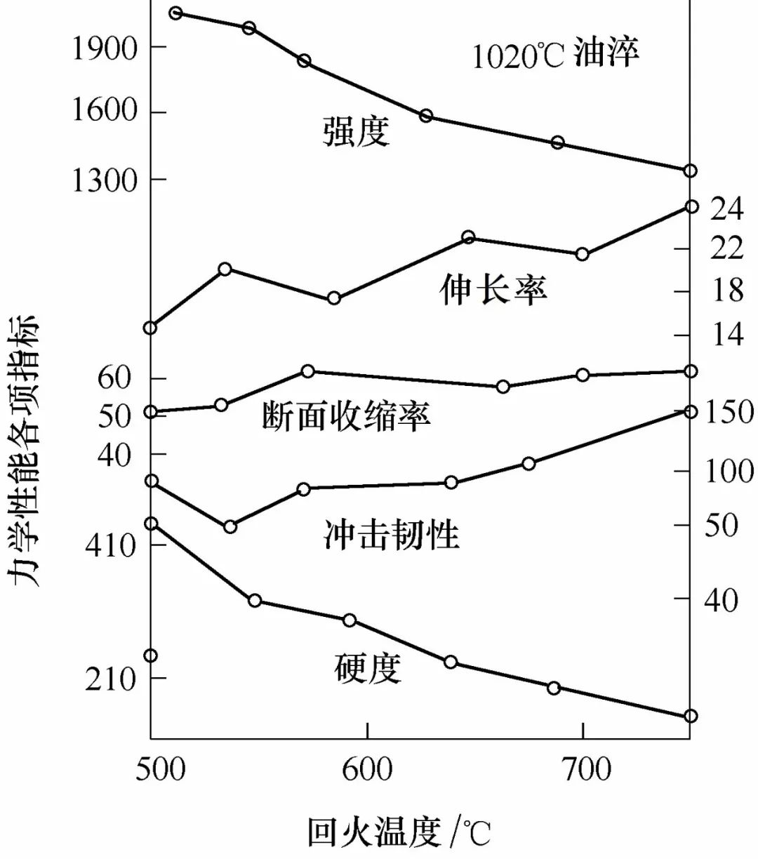 圖3表明,淬火溫度一定時,不同回火溫度對力學性能影響。回火溫度小于等于500℃,有高的硬度和強度,但塑韌性較低,隨著回火溫度逐漸升高,塑韌性逐漸升高,硬度與強度逐漸降低,幾乎成反比例變化。