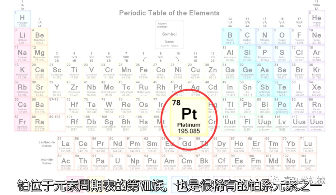 鉑密度高、延展性高、反應性低的灰白色貴金屬,屬于過渡金屬。鉑是地球地殼中罕見的元素,豐度排在第71名,平均豐度大約為5 μg/kg,地殼百萬分之0.001為鉑。