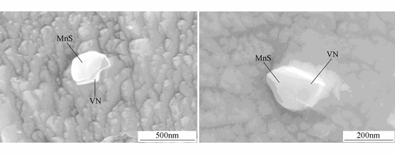 2  釩氮微合金化低碳鋼(0.11%C-0.41%Si-1.32%Mn-0.11%V-0.014%N)MnS夾雜上析出的VN顆粒形貌