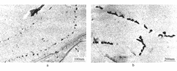除夾雜物上產生的復合析出外,釩氮鋼中V(C,N)顆粒可沿原始奧氏體晶界析出。圖5示出了薄板坯連鑄連軋的釩氮微合金化鋼中,沿原始奧氏體晶界輪廓析出的V(C,N)顆粒形貌,析出顆粒的尺寸范圍在10~40nm的范圍。