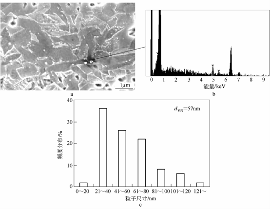 a-V(C,N)顆粒形貌及分布;b-V(C,N)顆粒能譜圖;c-V(C,N)顆粒尺寸分布