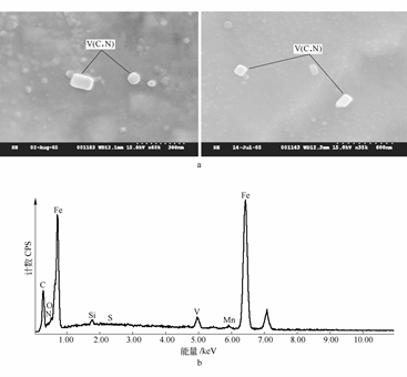 a-應變誘導析出V(C,N)顆粒形貌;b-V(C,N)顆粒能譜圖