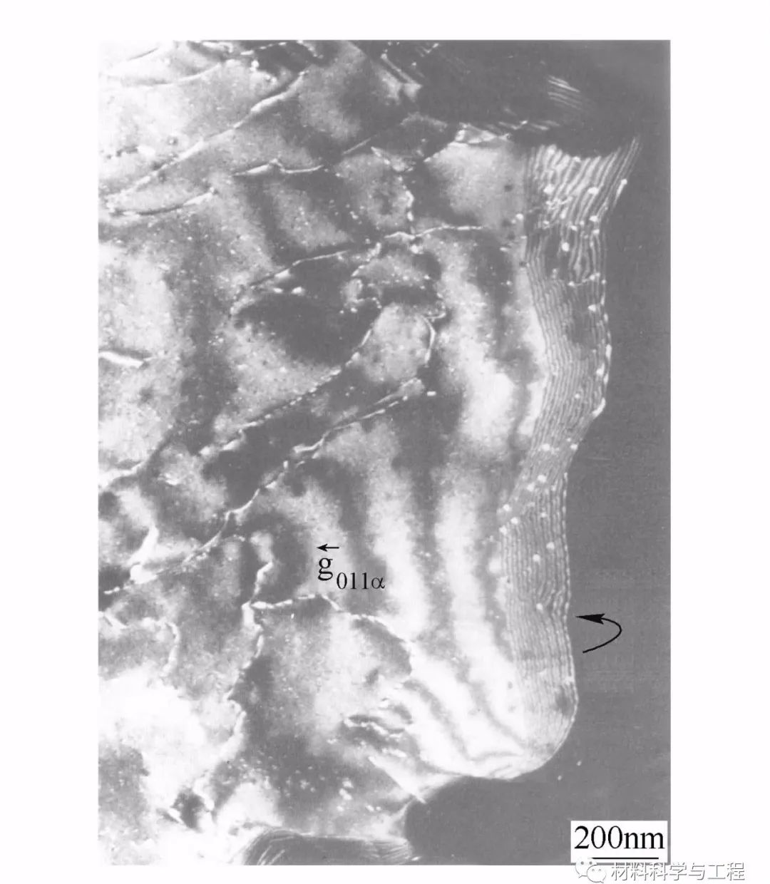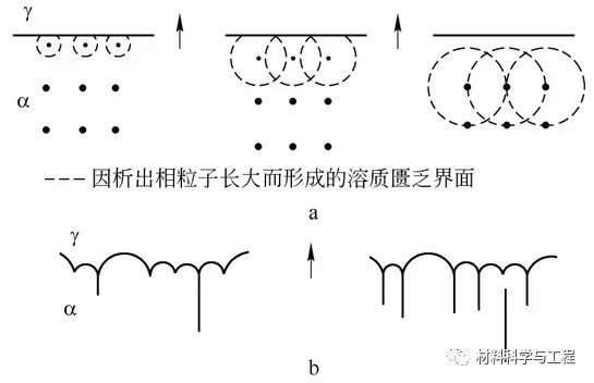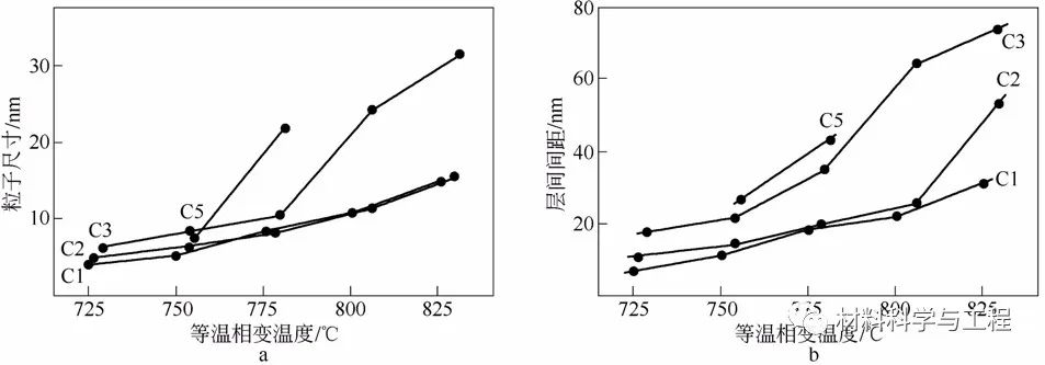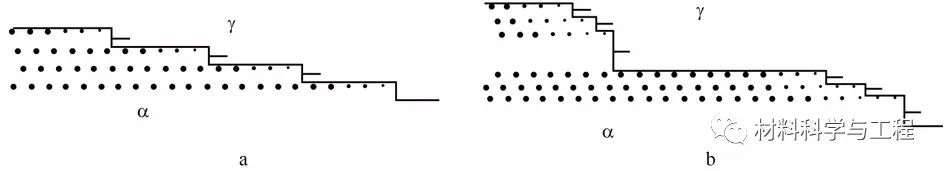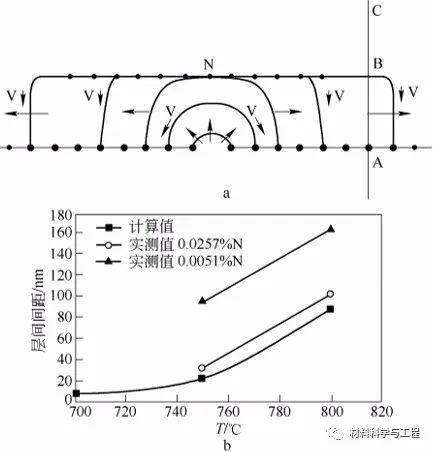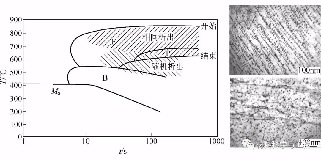 如圖1所示,在γ/α相變期間,V(C,N)可以跟隨著γ/α界面的移動,平行于γ/α界面以一定的間距形成片層狀分布的相間析出,或者在鐵素體內(nèi)隨機析出,即為一般析出。大量的研究表明,對于典型結(jié)構(gòu)鋼,相間析出一般在較高溫度形成,而隨機析出則產(chǎn)生于較低溫度區(qū)域,通常低于700℃。