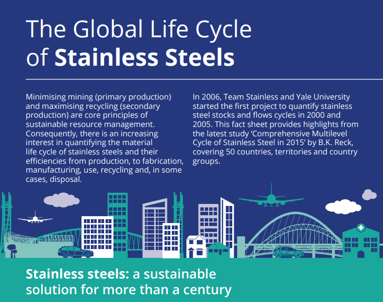 國際不銹鋼聯盟(Team Stainless)最近發布了“全球不銹鋼的生命周期”總結報告,對不銹鋼庫存和循環的量化研究結果進行了總結。由耶魯大學資深研究科學家Barbara Reck進行的 "2015年不銹鋼綜合多層級循環 "研究表明,平均而言,85%的不銹鋼在達到使用壽命后會被回收利用,或者成為新的不銹鋼(56%),或者成為碳鋼的寶貴鐵來源(29%)。