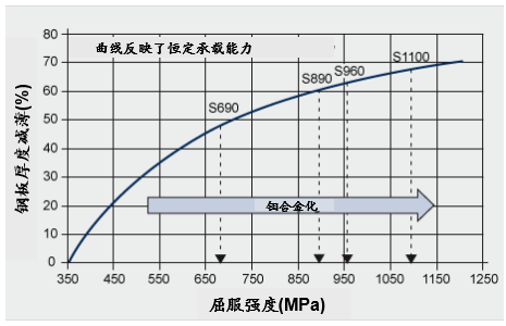 圖1 隨著鋼板屈服強度的增加,鋼板厚度(和重量)減少的潛力