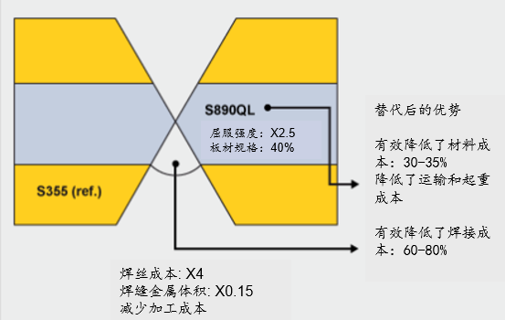 圖2 鉬合金化高強度鋼板成本節約示意圖,以S890QL代替S355為例