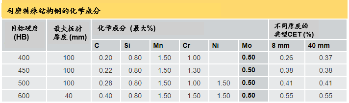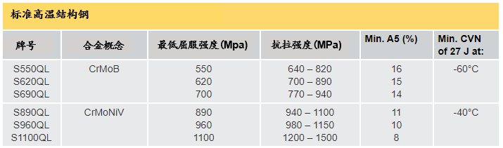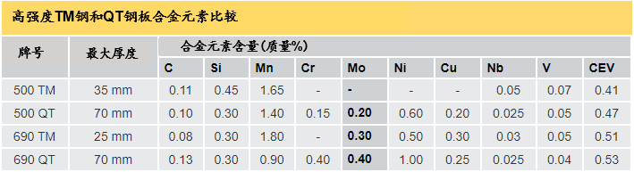 從碳當量公式可以看出,通過降低鋼的碳含量以提高其焊接性十分有效,同時改善了韌性,但降低了強度。因此,在板材生產過程中必須通過采用其他合金元素和形變熱處理(TM)來恢復強度。為了符合規定的最大碳當量,必須根據碳當量公式中的權重因子來優化合金成分。形變熱處理與加速冷卻相結合可以生產屈服強度高達690 MPa的鋼。對于指定的強度,TM鋼的碳當量始終低于調質鋼。而對于給定的強度,尤其是在較高強度下,TM鋼的最大厚度小于調質鋼的最大厚度。見以下對照表: