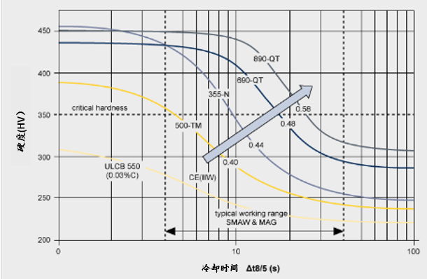 圖3顯示了焊接后從800°C到500°C的冷卻時間(ΔT8/5)對焊縫熱影響區(HAZ)性能的強烈影響。盡管在非常短的冷卻時間內碳含量控制著了馬氏體的硬度,但碳當量(CE)決定了冷卻過程中何時形成馬氏體。隨著CE的增加,臨界ΔT8/5會變長,并處于板材現場焊接所用的SMAW和MAG焊接工藝典型的工作條件范圍內。CE較高的鋼種需要特殊的焊接預防措施,包括對焊接區域進行預熱。隨著CE的增加,工藝處理窗口變窄(圖4)。焊接熱輸入過多會降低強度和韌性,而熱輸入過少會導致硬度過高,并增加熱影響區的冷裂風險。
