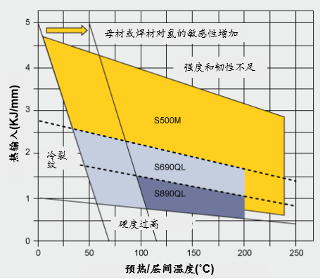 690或890MPa 調質鋼抗拉性能過匹配的焊接材料需要較高的合金含量,一般含有1-2.5%的Ni,0.5-1.5%的Cr和約0.5%的Mo。所得到的焊縫化學成分和鑄態顯微組織,常常使焊縫比超高強度母材的熱影響區更易發生氫致冷裂紋。為避免開裂,必須根據焊接金屬來調整預熱和層間溫度。降低碳當量,也不能放棄這些焊接預防措施。因此,通過TM軋制獲得的碳當量較低的高強度母材,基本上需要與較高合金化QT鋼相同的預防措施。
