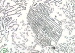 逐步加快冷卻速率減少了滲碳體的形成。水淬的冷卻速率很快,它完全壓制了滲碳體的形成。在這種情形下,碳被迫進入鐵素體結構的狹窄空間,由此形成的金相組織叫做馬氏體。這是最硬和最脆的鋼,見圖5。