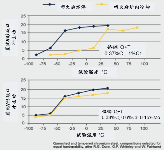 兩個鋼,一個不含鉬,一個含0.15%鉬,如果回火后水淬,則具有基本相同的韌性-脆性轉變行為(轉變溫度-50°C),但是,如果鋼回火后在爐子里慢慢冷卻,情況就不一樣了。鉻鋼的韌脆轉變溫度變成+25°C,而鉻-鉬鋼仍然保持在 -50°C。緩慢的冷卻速率沒有使含鉬鋼脆化,因此,含鉬鋼不太容易發生回火脆性。