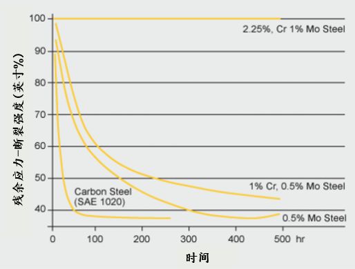 圖9 比較了暴露在540°C的加壓氫氣環境中,各類鋼斷裂強度的損失。未添加合金元素的碳鋼,強度損失明顯,暴露不到50小時,損失原來強度的50%以上;添加0.5%Mo或1%Cr-0.5%Mo之后略有改善,但對于此工況條件還是不夠的。而2.25%Cr + 1% Mo 的合金含量可提供如下程度的保護:經過500小時的暴露之后,原先的斷裂強度絲毫沒有降低。