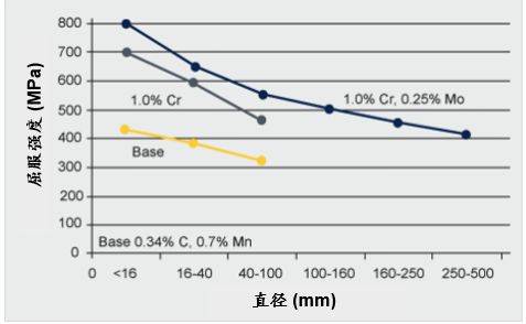 添加1%Cr使屈服強度提高了大約50%,再添加0.25%的Mo進一步提高了強度,且完全硬化部分直徑從100mm延長到500mm。