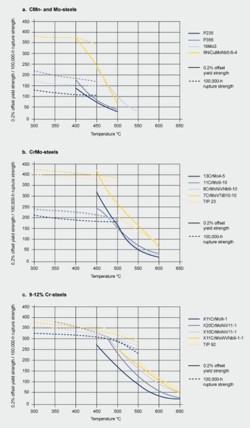 由于蠕變塑性隨著鉬含量的增加而明顯下降,因此鉬強化作用的潛能未被充分利用。Mo鋼另一個應用局限是500℃以上碳化鐵的分解--被稱為石墨化。這兩個問題的解決方案是采用鉻和鉬兩元素組合的合金化。實際上,CrMo鋼是第一個允許發電廠的蒸汽溫度超過500°C的鋼。經典CrMo鋼13CrMo4-5(T/P11)和11CrMo9-10(T/P22)的性能如圖2b所示。這些鋼的蠕變斷裂強度顯著優于簡單的Mo鋼(圖2a)。CrMo鋼可形成碳化鉻,在500°C以上較穩定,可防止石墨化。鉻也提高了抗氧化性。新開發的7CrMoVTiB10-10(T/P24)和T/P23具有極高的強度性能(見圖2b)。這些鋼基于并具有類似于T/P22的顯微金相組織。在T/P24基礎上添加鈦,釩和硼,在T/P23中添加鎢,釩,鈮和硼,可以顯著提高它們的強度。
