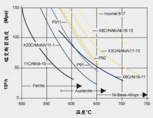 圖2 耐熱鋼的蠕變-斷裂強度(MPa)