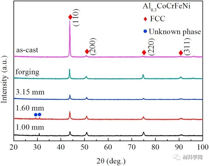 圖2從鑄態(tài)Al0.3CoCrFeNi HEA材料以及各種變形順序后的XRD衍射圖生成纖維。XRD結(jié)果表明,所有樣品主要是FCC結(jié)構(gòu)。