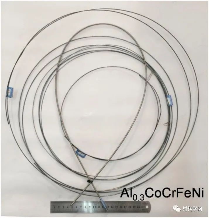 圖1熱拉光滑Al0.3CoCrFeNi纖維的宏觀視圖。纖維直徑范圍從1.00mm到3.15mm。
