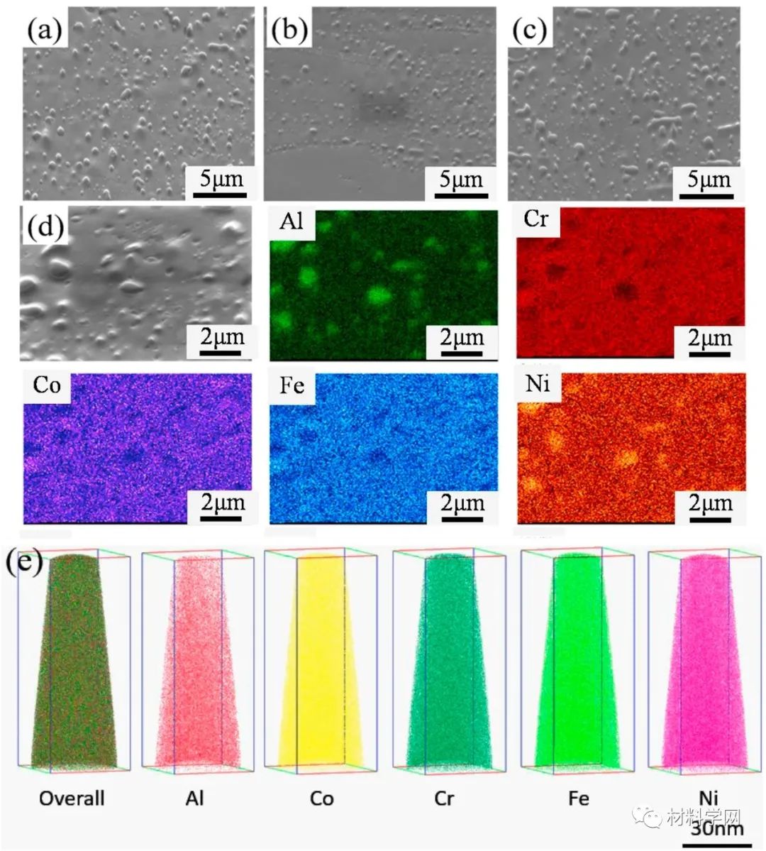 圖3 Al0.3CoCrFeNi纖維直徑:(a)3.15mm、(b) 1.60mm和(c) 1.00mm的掃描電鏡的微觀結(jié)構(gòu)圖像的縱向部分;(d) 1.00毫米直徑的能譜分析,和(e) APT-elemental圖顯示1.00mm直徑的纖維的原子位置的Al、Co、Cr、Fe、Ni的矩陣
