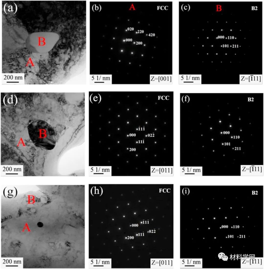 圖4 (a) 3.15,(b) 1.60,(c) 1.00 mm Al0.3CoCrFeNi纖維和(b, c), (e, f)和(h, i)分別選擇的區(qū)域衍射圖樣(SADP)。分別對TEM (A, d, g)和SADP (B, e, h)和(c, f, i)中的基體(A)和沉淀顆粒(B)進(jìn)行了鑒定
