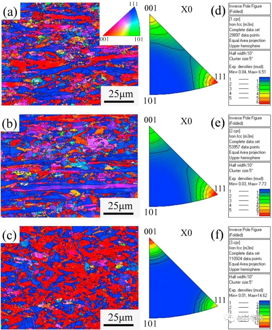 圖6不同直徑的Al0.3CoCrFeNi纖維的EBSD圖像和紋理演變。圖6(a) 3.15 mm、6(b) 1.60 mm和6(c) 1.00 mm是彩色的晶粒方向圖,其中顏色表示晶體方向平行于立體三角形中顯示的變形方向[(a)右上]。圖6(d)、6(e)和6(f)為直徑為3.15 mm、1.60 mm和1.00 mm的纖維的縱截面晶體學(xué)方向。IPFs突出了與變形方向?qū)?yīng)的紋理。IPF的尺度如圖所示,每個(gè)IPF的最大極點(diǎn)密度用紅色表示。