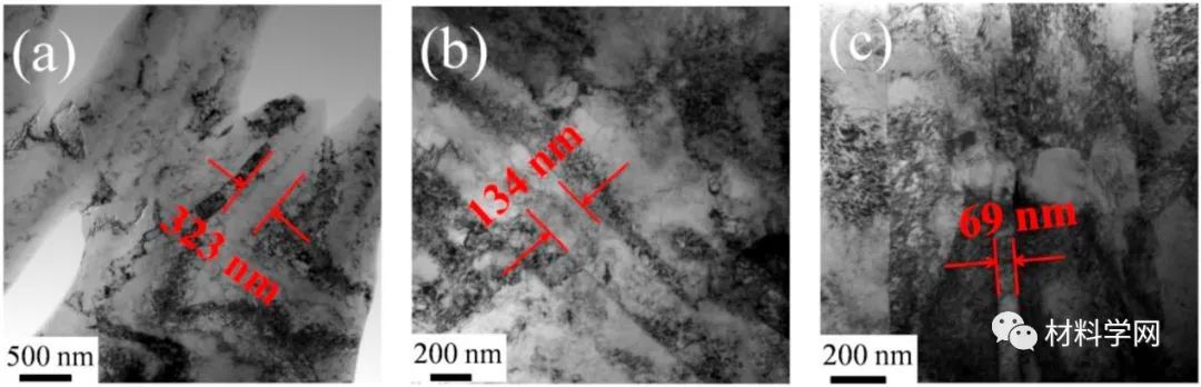 圖5 Al0.3CoCrFeNi纖維的TEM顯微圖:(a) 3.15 mm,(b) 1.60 mm,(c) 1.00 mm,顯示高位錯(cuò)密度