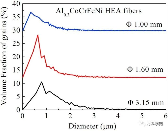 圖7不同直徑Al0.3CoCrFeNi纖維的晶粒尺寸的統(tǒng)計(jì)體積分布。