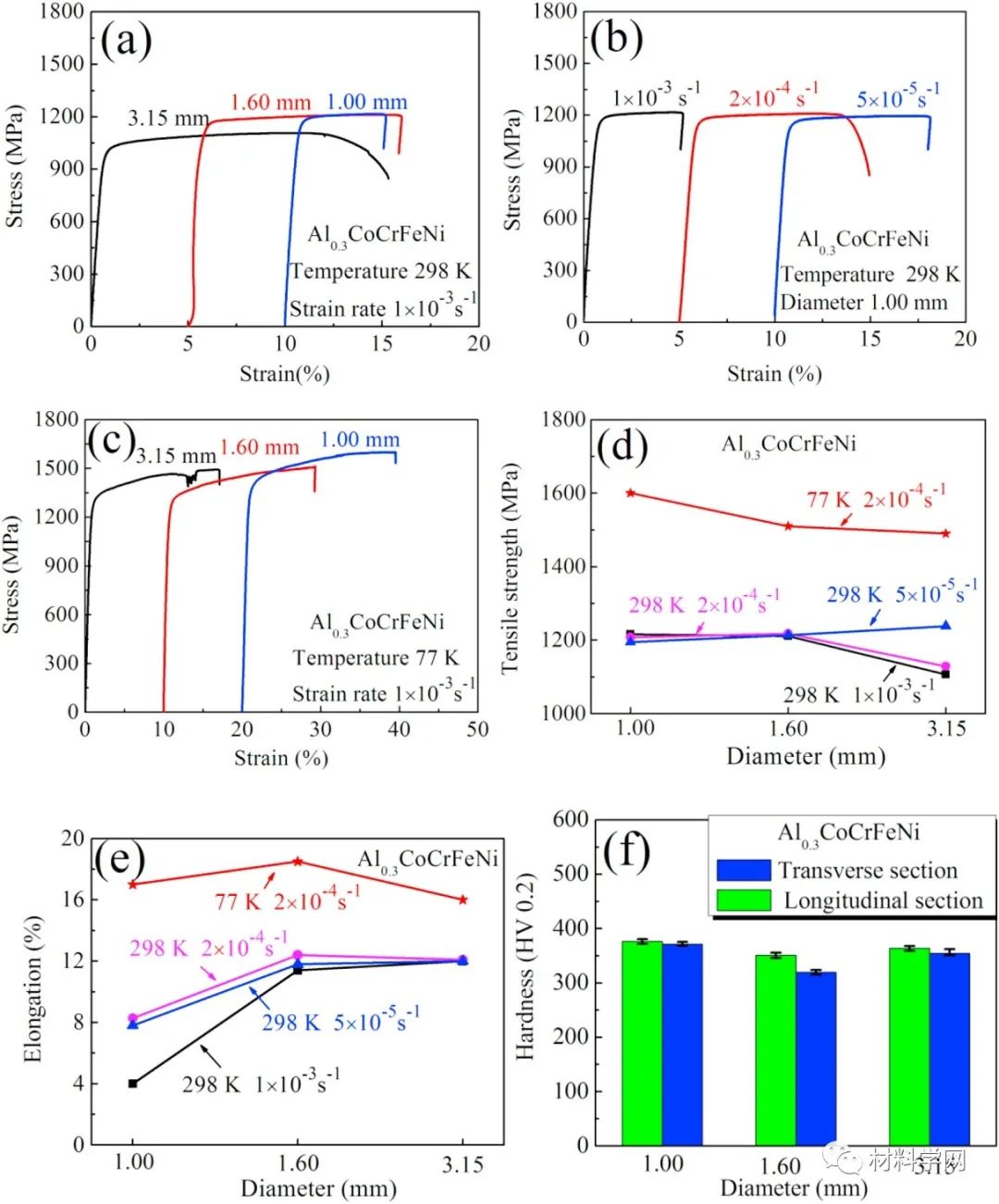 圖8 Al0.3CoCrFeNi纖維的力學(xué)性能:(a)和(b)室溫下不同直徑和應(yīng)變率的工程應(yīng)力-應(yīng)變曲線;(c) 77k時(shí)的工程應(yīng)力應(yīng)變曲線;(d)和(e)抗拉強(qiáng)度和伸長率分別與直徑的函數(shù)關(guān)系;(f)維氏硬度隨直徑和截面(即縱向和橫向)的變化而變化。
