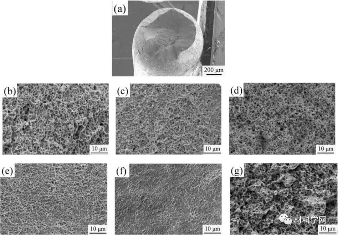 圖9 (a) 直徑為1.0mm的Al0.3CoCrFeNi纖維斷口呈頸縮狀的SEM圖像;(b)、(c)和(d)呈現(xiàn)應(yīng)變率分別為1×10-3 s-1、2×10-4 s-1和5×10-5 s-1;(e)、(f)和(g)分別顯示了在77 K直徑為3.15 mm、1.60 mm和1.00 mm的拉伸試樣在應(yīng)變率為2×10-4 s-1。