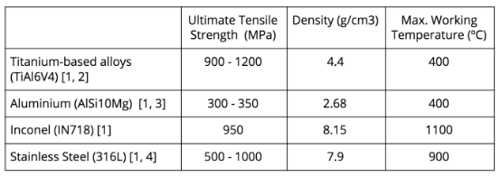 鈦基合金以其高的比強度,剛度和耐腐蝕性而著稱,在航空,生物醫學和化學工業中廣受歡迎。如上表所示,與其他高性能材料相比,這些合金的抗拉強度很高,而其密度僅為4.4 g / cm3。