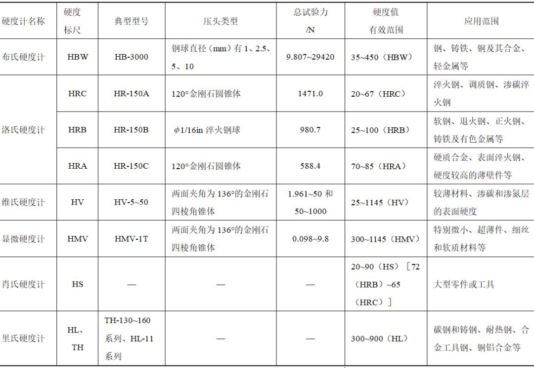 主要有布氏硬度計、洛氏硬度機、維氏硬度計、顯微硬度計、肖氏硬度計及里氏硬度計等。它們的應用范圍有較大的區別。幾種硬度計的適用范圍和特性對比如表4所示。