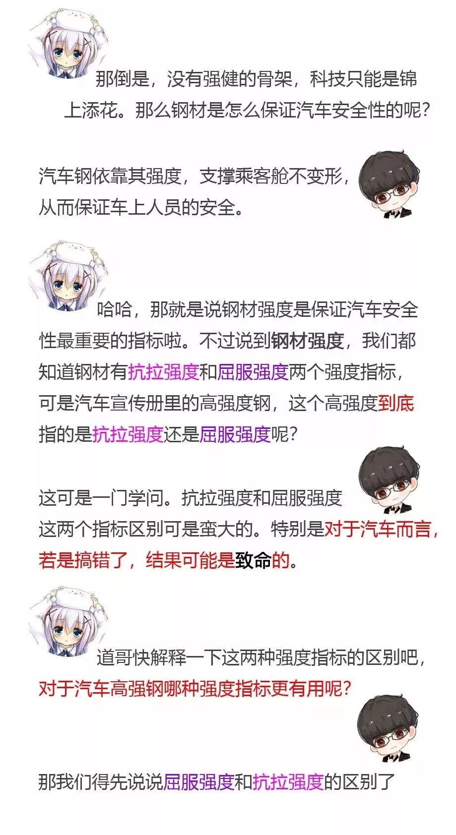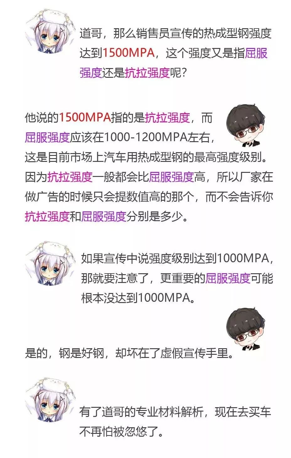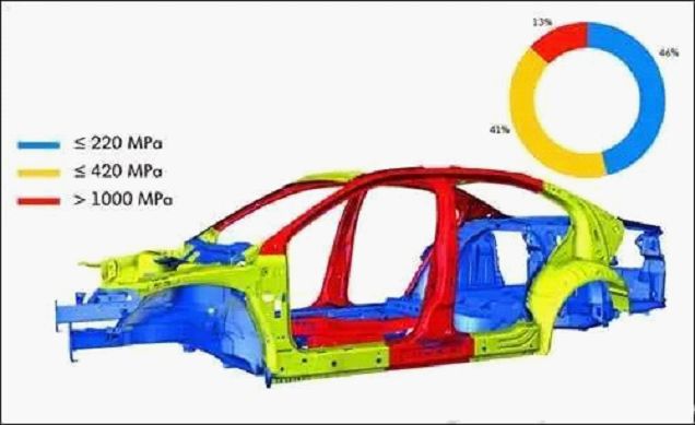 在看廠商宣傳資料時看到“我們的車身采用了1000Mp級別高強度鋼制造”這種宣傳語時不要誤以為全車都是用這種鋼造的,實際上可能只有四門防撞梁那幾根桿達到了這個強度級別。
