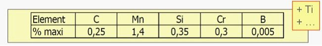 人們開發了一系列新材料的鋼板,典型的牌號為22MnB5,成分如下圖所示。由于這些鋼板的主要強化元素為硼,它們也被稱為硼鋼。
