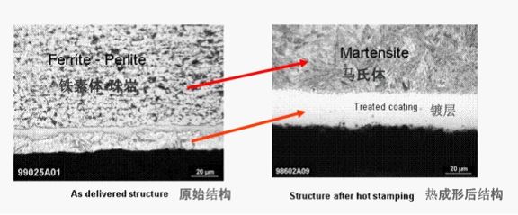 22MnB5原始金相組織為鐵素體+珠光體,加熱到900攝氏度左右轉變成為奧氏體,在模具中液壓成型并淬火,轉變成為100%的高強度馬氏體組織,成型性能好,成型后強度高,性能非常優越。