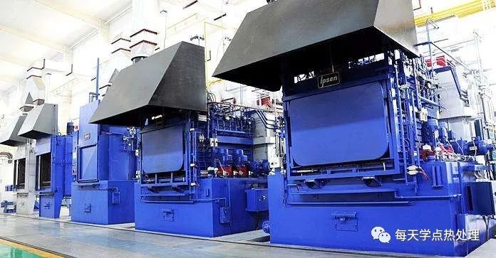其主要功能是按工藝要求對爐內機械動作實行自動控制。密封箱式滲碳爐可實現三種工藝方式,即直接淬火、重新加熱淬火和氣體淬火。它們的操作程序都儲存在可編程序控制器中。①工藝過程自動控制。按滲碳工藝要求分為三類:滲碳工藝、修正滲碳工藝(即對已滲碳工藝的返修工藝)和保護氣氛熱處理。這三類工藝又可按不同淬火方式分別編制程序。計算機工藝程序編制是通過鍵盤輸人的,輸入材料數據和過程數據,例如,鋼材碳含量、合金化系數、炭黑極限、爐氣中H2、CO含量,有效硬化層深度及其碳含量等;再輸入各個程序段的數據,如設定溫度、設定滲碳最終要求達到的滲層深度等。計算機按工件最終目標進行控制,調節工藝參數,當達到99%的滲碳層深后,爐溫降到淬火溫度并保溫,到達要求的滲碳深度后,工件出爐送往淬火槽。②滲碳工藝的模擬仿真功能。在計算機控制中,通過模擬運算可實時顯示溫度和碳勢工藝曲線及實時記錄曲線、表面碳濃度梯度、設定溫度和碳勢、實時滲層深度和時間等內容。從而以總覽的形式表示各種溫度和碳勢的狀況。采用雙速電動機,有負荷時慢速運動;空載時快速運動。由可編程序控制器按工藝過程要求控制。工件入油淬火時,升降臺下降速度由快變慢,由雙速電動機帶動。3) 兩臺獨立的淬火油攪拌裝置,其攪拌速度可變,在工件入油后可分期控制淬火強度。以上機械動作的傳動電動機,除爐門、中爐門和攪拌風扇外,均采用雙速電動機,均由可編程序控制器控制,在程序控制下實現自動切換。4) 控制裝卸料、淬火升降臺、爐門和爐頂風扇的電動機一旦停電,均可用手柄搖動。為了加快滲碳后工件在前室的冷速,除在前室頂部安裝有大功率的離心風扇外,為防止在前室壁結露,還在其頂部和兩側面安裝了扁平油箱,內充普通全損耗系統用油,熱油通過循環泵進入爐體外側的水冷卻器。在進入冷卻器的熱油管路上安裝了一個溫度傳感器,控制供水閥的開度,實現了前室爐壁油的自動循環冷卻,其油溫控制在70℃左右。