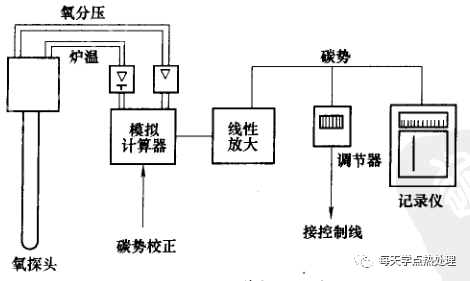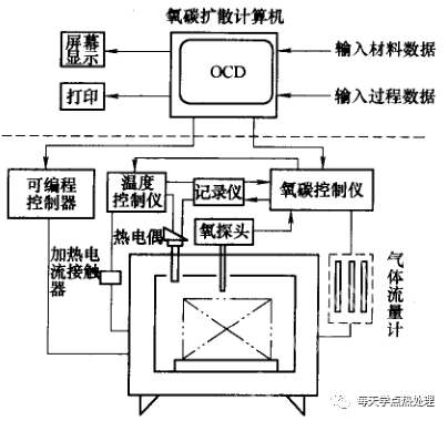溫度控制系統由熱電偶、智能調節儀和晶閘管組成。溫度信號同時傳輸給氧碳控制儀和計算機。①中央指令系統:氧碳擴散控制計算機(O. C. D) 。②二級控制系統:可編程序控制器,碳勢控制儀(或氧碳控制儀)。檢測爐氣氛碳勢的直接儀表,常放置在爐前操作,故常稱前沿機。該系統以氧探頭作傳感器,檢測爐氣氛氧含量,以氧電勢輸出,在碳勢控制調節儀中與設定值進行比較,進行PID運算輸出控制量,控制執行元件,調節富化氣供入量,同時把氧電勢傳輸給計算機。