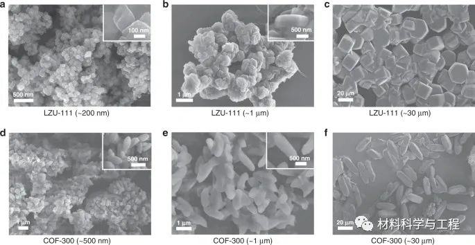 圖2 不同尺寸的LZU-111和COF-300晶體的掃描電子顯微鏡(SEM)圖像。