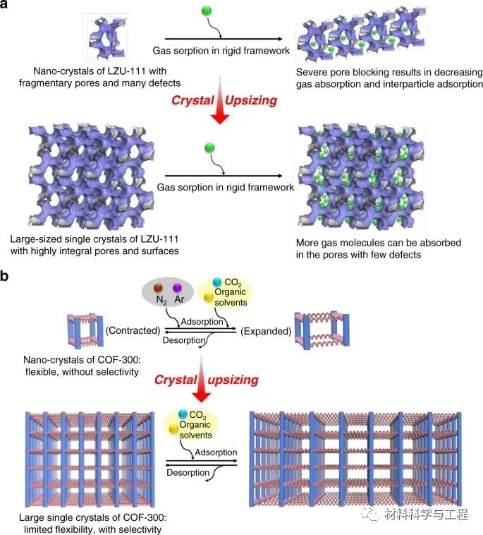 在此,研究者成功地將晶體尺寸控制的合成方法,應用于不同類型的COFs,并報道了不同晶體尺寸效應的COFs。對于具有剛性螺旋通道的LZU-111,尺寸效應通過影響孔隙完整性反映在孔隙表面積上;而對于具有直道通道的柔性COF-300,晶體尺寸通過改變重復單元的數量,來控制結構的靈活性,最終改變吸附選擇性。
