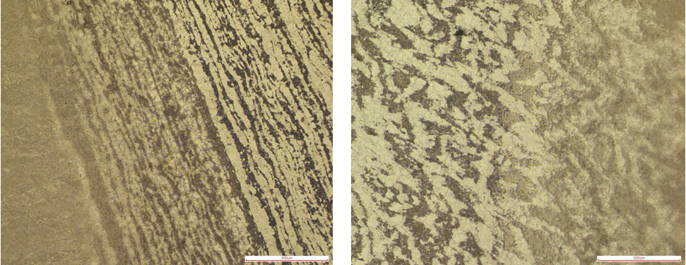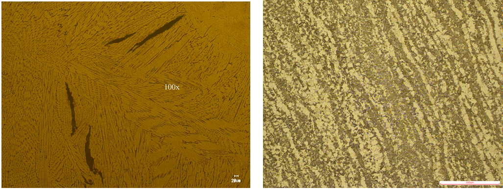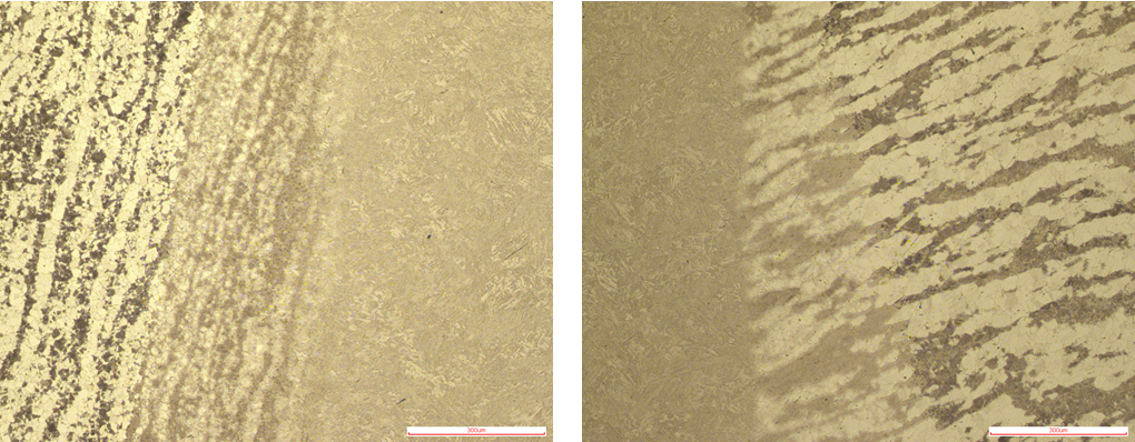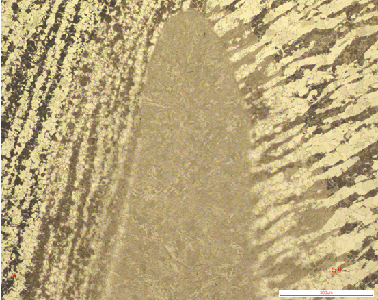 材料微區含碳量嚴重超標,主要由于TL4521這個材料合金元素含量很高,合金元素沿軋制方向偏析形成帶狀組織,通常鋼液在冷卻凝固過程中以枝狀晶的方式長大,在不同時期凝固的晶內和枝晶間的化學成分不均勻,存在合金元素偏析。帶狀組織分一次帶狀和二次帶狀之分。合金元素的帶狀偏析會造成碳元素的條帶狀偏析,不同條塊區域的相變溫度就存在差異,在熱處理或加工后的冷卻過程中,先共析鐵素體優先在碳含量低、Ar3高的位置析出,同時向相鄰區奧氏體中排出碳,進一步造成碳的不均勻分布。這個過程在奧實體化的冷卻過程中發生,冷卻越慢,先共析鐵素體轉變越充分,碳元素分布越不均勻。由于這幾種原因造成微區含碳量嚴重超標。于是我們按照圖樣要求,對齒環材料進行更換,對于齒坯正火金相嚴格控制,采用上限溫度正火,加長正火時間來改善正火金相。后來的產品嚴格按照焊接工藝執行,焊前預熱焊后緩冷的工藝,所有產品沒有出現裂紋。焊接金相見圖11。