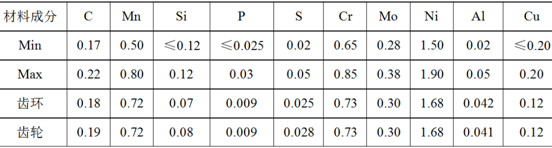 根據標準計算出的碳當量大于0.4%,產品應該對焊接工藝進行控制。但是產品出現熱裂紋,就是調整工藝也很難避免。我們認為這個產品主機廠已經試制成功,并且批量生產好多年,是否我們采購的材料不符合圖紙要求,或說圖樣對于產品焊接有什么特殊要求。于是我們對產品圖樣進行核查,發現齒環材料圖樣要求是TL4227,根據我們以往的概念,齒環、齒輪應該采用同一種材料,而不是2種材料。對于TL4227的化學成分見表2。