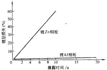 所選用的覆蓋層材料為陽極性與陰極性兩種。如果鍍層材料的電極電位比基體金屬低時(負), 它成為陽極,基體是陰極,受覆蓋層的保護。鍍層中存在空隙時也不影響防蝕效果,例如鋼鐵表面鍍Zn屬此類情況。如果鍍層材料的電極電位比基體高(正),則基體為陽極,鍍層是陰極,鍍層中如存在空隙時將加速基體金屬腐蝕。例如鋼鐵表面鍍 Sn屬此類鍍層材料。將基體金屬浸人熔融狀態的液體金屬中,使表面沾上一層鍍層金屬,防止基體受腐蝕。熱浸鍍Zn的歷史最長,至今仍是鋼鐵防腐蝕的重要措施。鍍Zn層具有良好的耐蝕性,在水及大氣介質中Zn的平均腐蝕速度是鋼鐵的1/25。鍍Zn層在城市大氣中的腐蝕速度約為2~7μm/a(注:a—年的縮寫,下同。), 有優良的耐蝕性,可使鍍Zn板壽命達到50年。海洋大氣中的腐蝕速度與城市大氣相同,約為1~7μm/a, 飛濺區的腐蝕速度約為15μm/a.熱帶地區鍍Zn層的腐蝕速度也不大,干大氣中小于 2μm/a, 潮濕大氣中小于3μm/a, 海岸區小于6um/a。鍍Zn層在硬水中腐蝕速度約為2.5mg/ (㎡·a) , 在軟水中約為硬水中10倍。水中溶解氧越多,腐蝕越快。水溫對鍍Zn層的腐蝕有影響,工業用水40℃左右、軟水90℃左右腐蝕最快。浸泡在海水中的鍍Zn 鋼板的腐蝕速度約為12~24μm/a。熱浸鍍AI防腐蝕方法發展迅速,其工藝與熱浸Zn相似。Al的電極電位為-1.66V, 比Fe(-0.44V) 和Zn (-0.1763V) 都低。鍍AI層能形成致密又穩定的Al2O3, 保護膜,起到良好的防蝕作用。如鍍 AI層發生機械損傷時,鍍Al層對鋼鐵基體仍可起保護作用。鍍Al鋼板耐大氣腐蝕,也耐海水腐蝕、土壤腐蝕及應力腐蝕。鍍Al 鋼板耐大氣腐蝕能力是鍍 Zn 鋼板的3~6倍。圖1 是熱浸鍍Zn 鋼板與熱浸鍍 Al 鋼板耐工業大氣腐蝕的比較。鍍Al鋼板還具有耐含S介質的腐蝕能力。表1 及表2 是熱浸鍍Al鋼板在高溫氧化、硫化氣氛及H2O介質中的腐蝕效果。▼表1 中的暴露試驗在高溫氧化、硫化氣氛