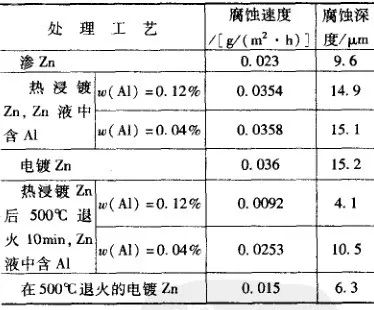為提高材料耐腐蝕性,對零件表面滲金屬的方法已有相當長歷史,應用十分廣泛。滲金屬不僅能提高材料耐蝕性,也能提高硬度及強度。所滲的金屬主要有Zn、Al、Cr 及 Si 等。滲Zn 與熱浸鍍Zn 比較,前者的耐蝕效果更好,如果鍍Zn后在500℃左右退火,產生Zn擴散層,可明顯提高耐蝕性,如表3 所示。▼表3 滲Zn和鍍Zn制品的耐蝕性比較