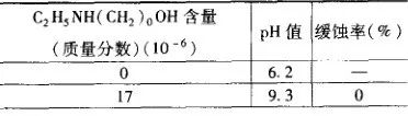 如將有機磷酸與無機磷酸鹽復合使用,其緩蝕效果更好。有機磷酸的化學穩定性高、不易水解,可耐較高溫度,有較好的阻垢能力,是有發展前景的緩蝕劑。應用于中性水介質的緩蝕劑有芳香族羧酸及脂肪族取代羧酸(例如羥基酸、氨基酸及酰胺羧酸等)及其鈉鹽。例如酰基肌氨酸的原料容易獲得,無毒性,不產生環境。污染,適用于pH=6~11的軟水或硬水介質,除冷卻循環水外,鍋爐水、鹽水系統、高爐及轉爐冷卻水均可應用,是有發展前景的緩蝕劑。水中溶解中性鹽,例如 NaCI、KCI、MgCl2、 CaCl2、Na2CO3、Na2SO4等,能促進金屬腐蝕。用于冷卻水系統的緩蝕劑多數也可作為中性鹽水溶液的緩蝕劑。但是這些鹽含量高時,應選用緩蝕效果更好的緩蝕劑。烷氨基醇對NaCl、CaCl2水溶液中的碳鋼有很好的緩蝕作用,緩蝕率可達到90%以上。表5 是2-乙氨基乙醇對在w (NaCI) 為3%水溶液中碳鋼的緩蝕效果。隨其含量增加緩蝕效果增大,pH值也增加。當含量為3. 1x10E-4時 pH=10.3, 此后再增加緩蝕劑含量時、pH值不變。如果加入NaOH調pH值,也能產生一定緩蝕效果。▼表5 2-乙氨基乙醇對在w (NaCI)