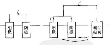 在水及土壤中的金屬結構或設備可采用陰極保護法防止或減緩腐蝕。陰極防護方法有兩種,一是將被保護體與直流電源連接,通過輔助陽極和介質使電流到達被保護結構;二是采用比被保護金屬的電極電位低(負)的金屬作為犧牲陽極,犧牲陽極首先溶解,釋放出的電流使結構陰極極化至所需要的電位,產生防蝕作用。圖3 所示為陰極保護示意圖。