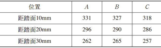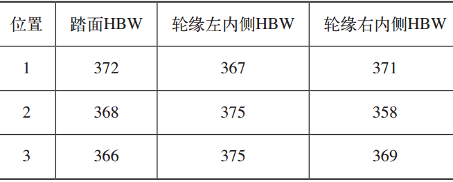 將車輪踏面外圓圓周等分3點,選取踏面及輪緣內側進行硬度測試,實測硬度情況見表4。