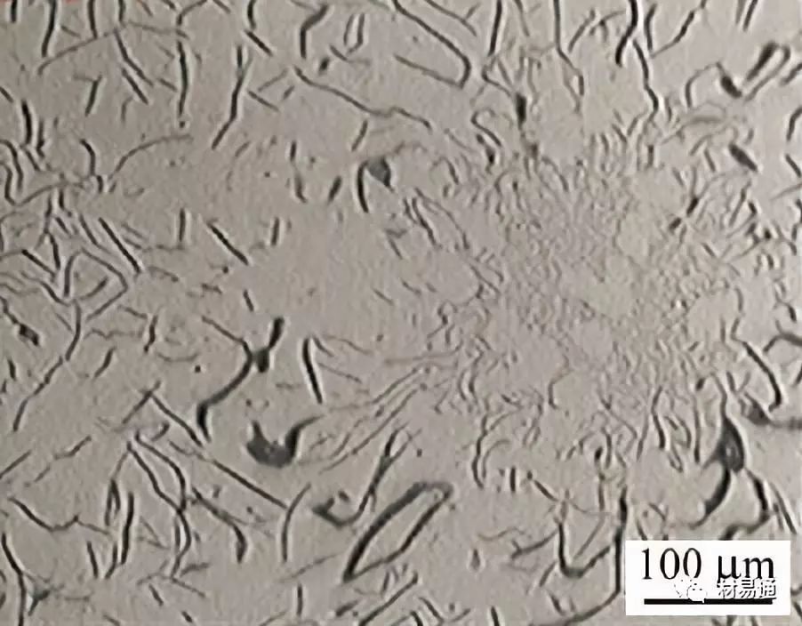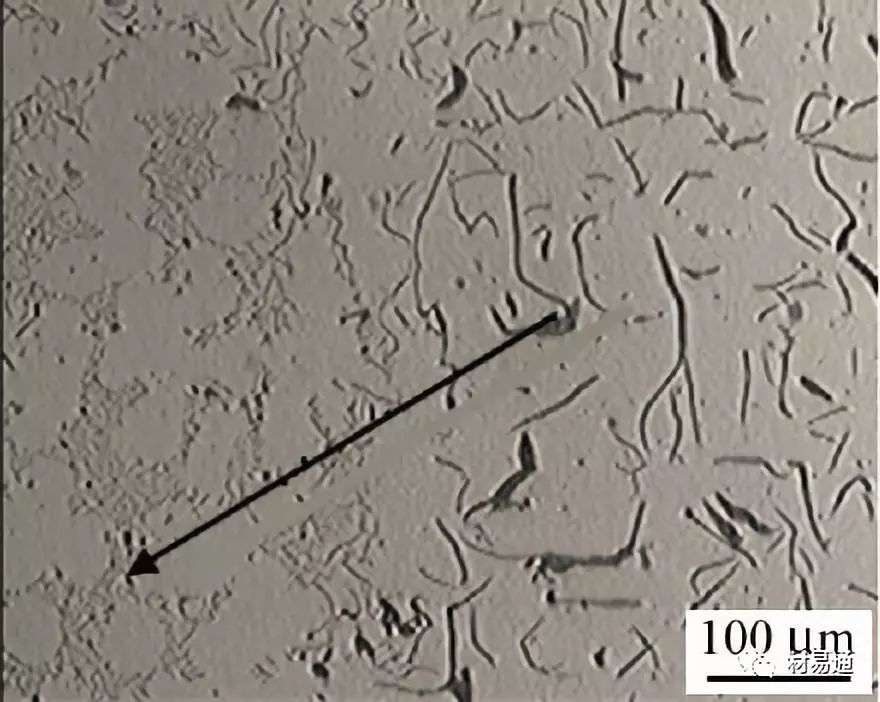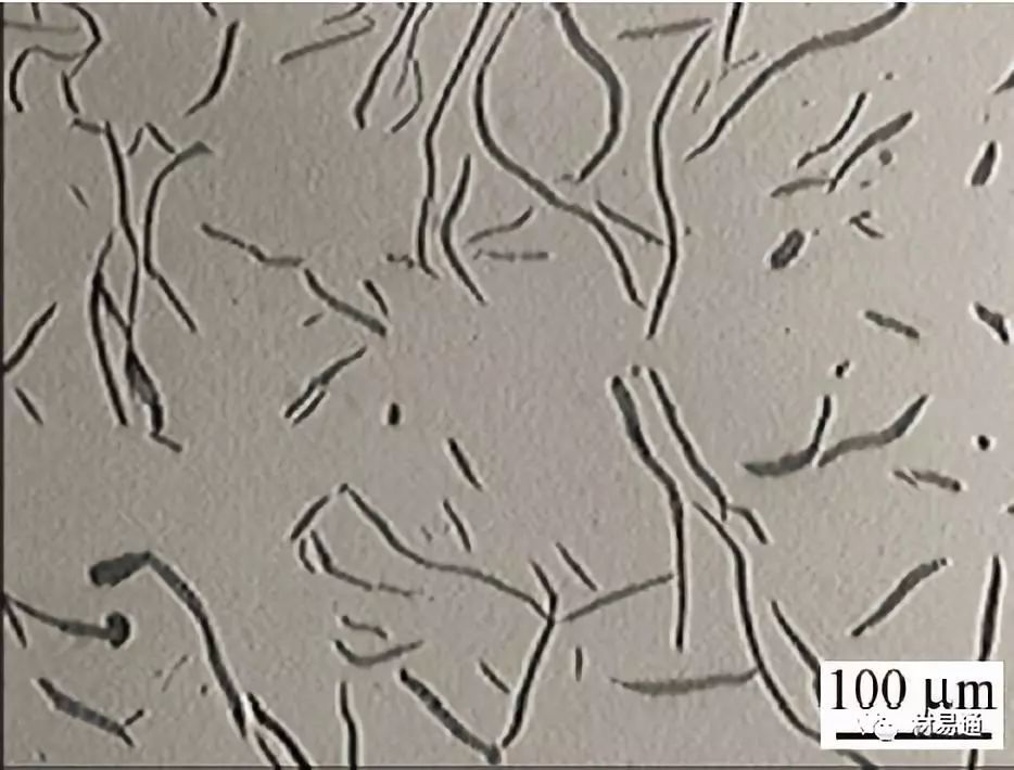E型(枝晶片狀)石墨也是一種過冷石墨,是在過冷度比產(chǎn)生D型石墨更大時(shí)形成的,因此其分布更不均,方向性也更明顯,對(duì)鑄鐵的性能也更加不利。E型石墨存在于碳含量較低的亞共晶成分的鑄件中,鐵液凝固時(shí),先析出樹枝狀?yuàn)W氏體初晶,余下的鐵液發(fā)生共晶轉(zhuǎn)變,一部分轉(zhuǎn)變?yōu)?/span>D型或A型,另一部分在奧氏體的二次分枝間呈方向性排列即為E型。E型石墨是亞共晶鐵液在比形成D型石墨更小的過冷度下形成的,所以石墨片較D型要長(zhǎng)。E型石墨不會(huì)單獨(dú)出現(xiàn),它常同D型、A型石墨共生。一般一個(gè)金相視場(chǎng)中E型石墨所占面積比例不超過20%。E型石墨使鑄件性能呈方向性,生產(chǎn)中應(yīng)加以控制。